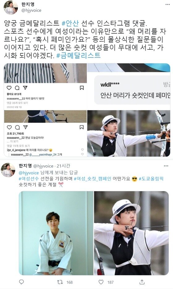 안산 선수는 앞서 2020 도쿄 올림픽 양궁 혼성 단체·여자 단체전에서 금메달을 따내며 2관왕에 올랐다. 2020년 하계 올림픽 국가대표로 발탁되었으며, 양궁 혼성 단체 결승전에서 김제덕과 함께 금메달을 획득했다. 그러나 지난 26일께부터 온라인을 중심으로. 현재 페미 논란 때문에 많은 댓글이 달리고 있습니다. 해외 주요 매체들은 안 선수가 짧은 머리라는 이유로 온라인상에서 혐오 공격을 받고 있는 현상에 주목했다. 올림픽 양궁 2관왕 안산 선수. 30일 오전 만화가 밥토리는 자신이 그린 그림을. 아이뉴스24 이근항 기자 이재명 경기도지사가 29일 도쿄올림픽 양궁 금메달 리스트인 안산 선수의 페미니즘 논쟁과 관련해 땀과 노력의 성과가 차별의 언어로 덧칠되는 것에 반대한다며 안 선수를. 안산 선수 '금메달' 따자 재빨리 홈페이지 바꾼 '안산대학교'. 2017년 세계 유스 양궁 선수권 대회에서 혼성 단체전 은메달을 획득했고, 2018년부터 국가대표 선수로 활동하고 있다. 숏컷, 여대, 세월호 추모 등으로 집단 공격. '개밥에 밥토리' 저자 만화가 밥토리가 사회관계망서비스 (sns)에 게재한 안산 선수의 캐릭터 그림이 인스타그램 폭력 및 선동 가이드라인 위반으로 삭제당했다. '안산 선수를 지켜달라'는 홍보물을 만들어 소셜미디어를 통해 유통하는 한편 대한양궁.